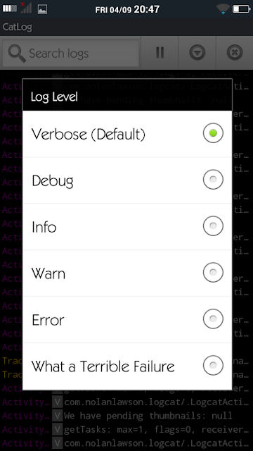 Catlog merupakan aplikasi penampil log/jurnal dari proses yang sedang berjalan pada system android secara real time sehingga bisa diketahui bilamana terjadi error atau warning maupun fatal error sehingga sangat berguna sebagai debugging saat mencari tahu dan memperbaiki jika ada bug/masalah pada aplikasi yang kita mod. Catlog tersedia gratis di Play Store.